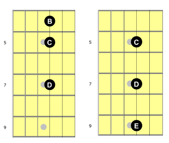 Third-string notes include B, C, and D. I also included C, D, and E notes for the second exercise.