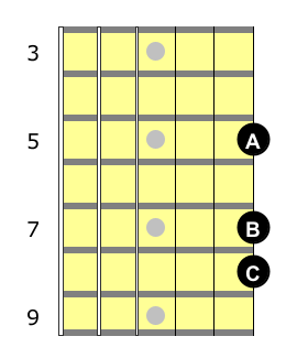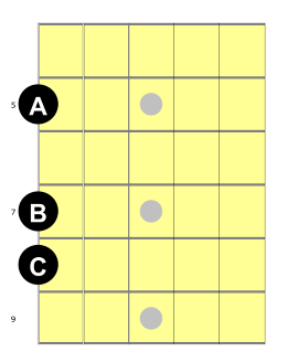 First, on the lowest string, the sixth string will include the notes A, B, and C.